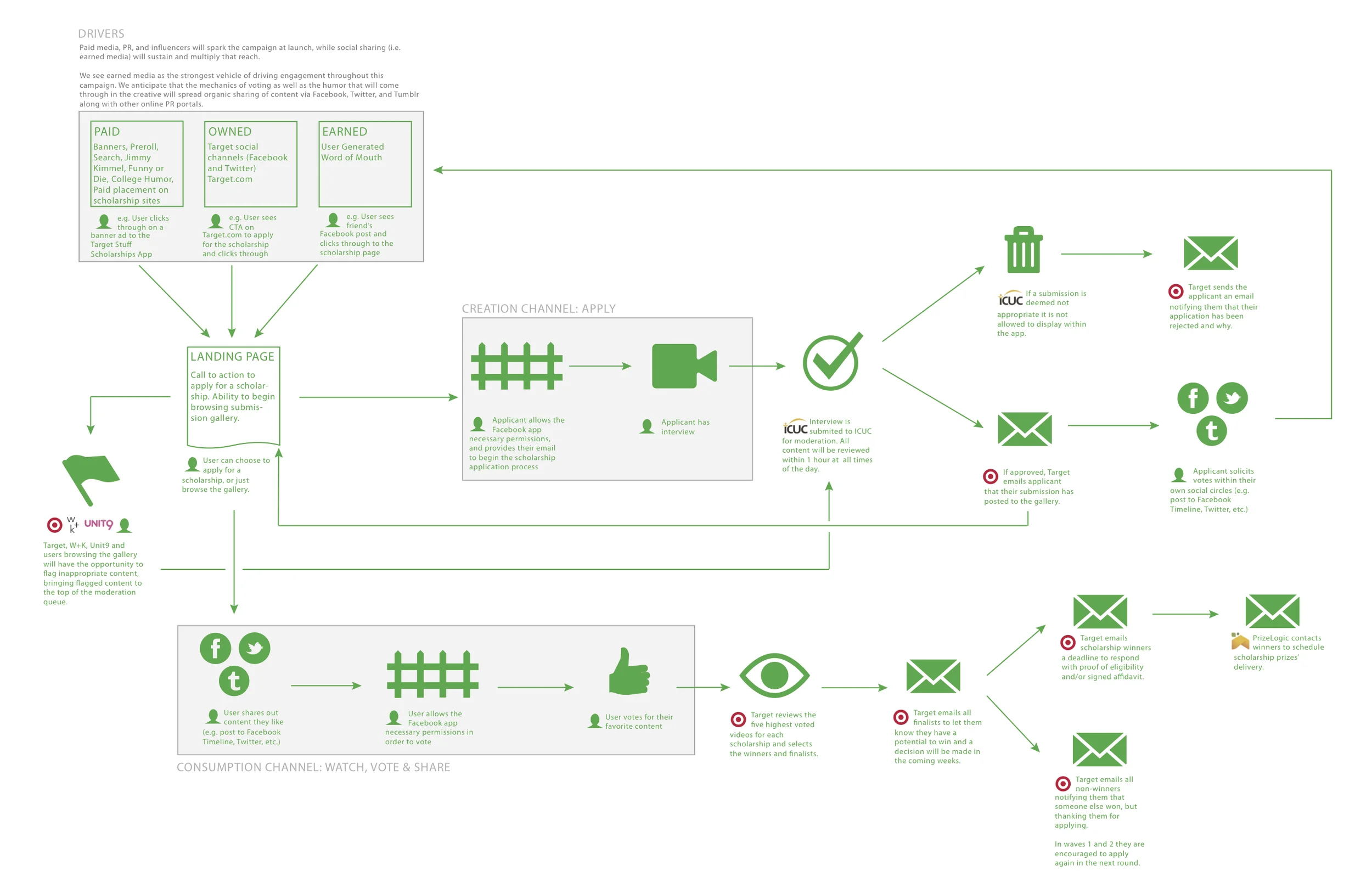 Note: For this project I mapped out the campaign/process flow (below) to define our overarching requirements and then played a UX consultant role as our vendor was responsible for wireframes and site design. We met frequently with the vendor and continued to evolve and critique the site UX throughout the project. Interview functionality, navigation, voting mechanics, and everything else were scrutinized and tweaked to ensure that we met our objectives.